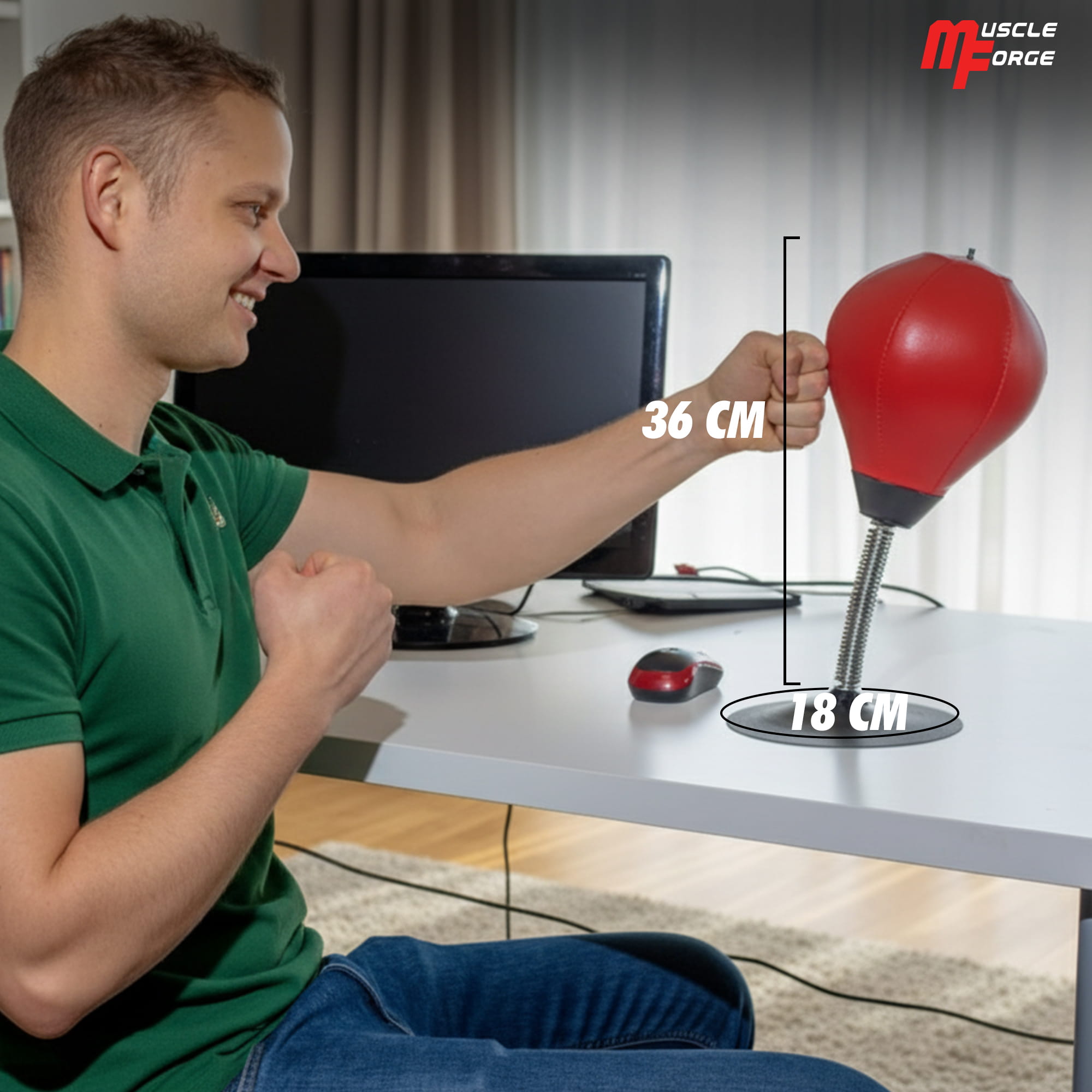 Wybierz antystresową gruszkę bokserską na biurko MuscleForge® w nowej wersji z uchwytem biurkowym, dodaj ją do koszyka i sprawdź, jak może wprowadzić więcej ruchu i luzu do Twojego dnia pracy ⚡