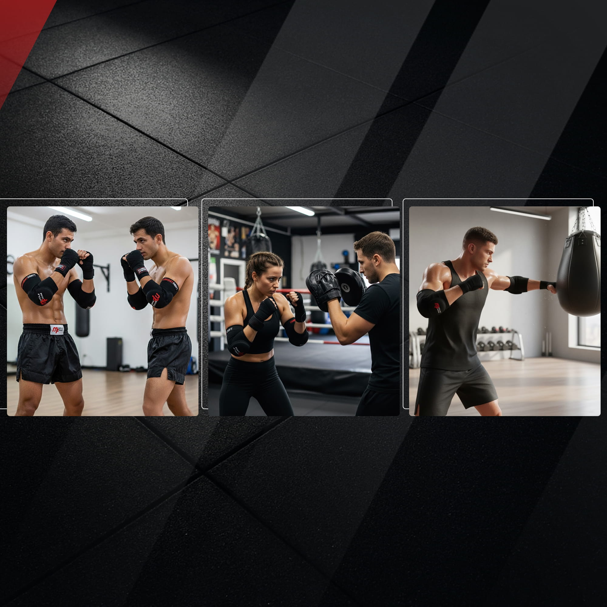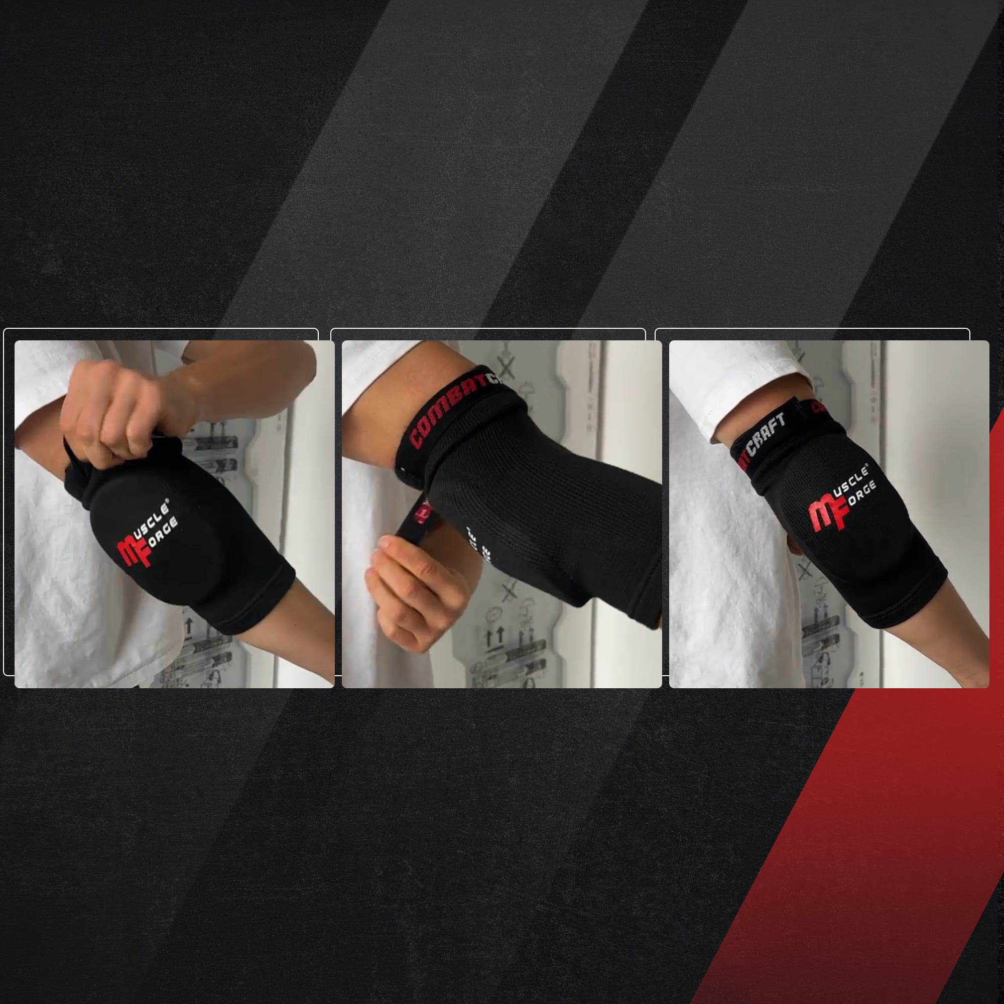 Wsuwane ochraniacze łokci MuscleForge CombatCraft L zapewniają lekką kompresję, skuteczną amortyzację uderzeń i swobodę ruchu w treningu i lekkim sparingu.