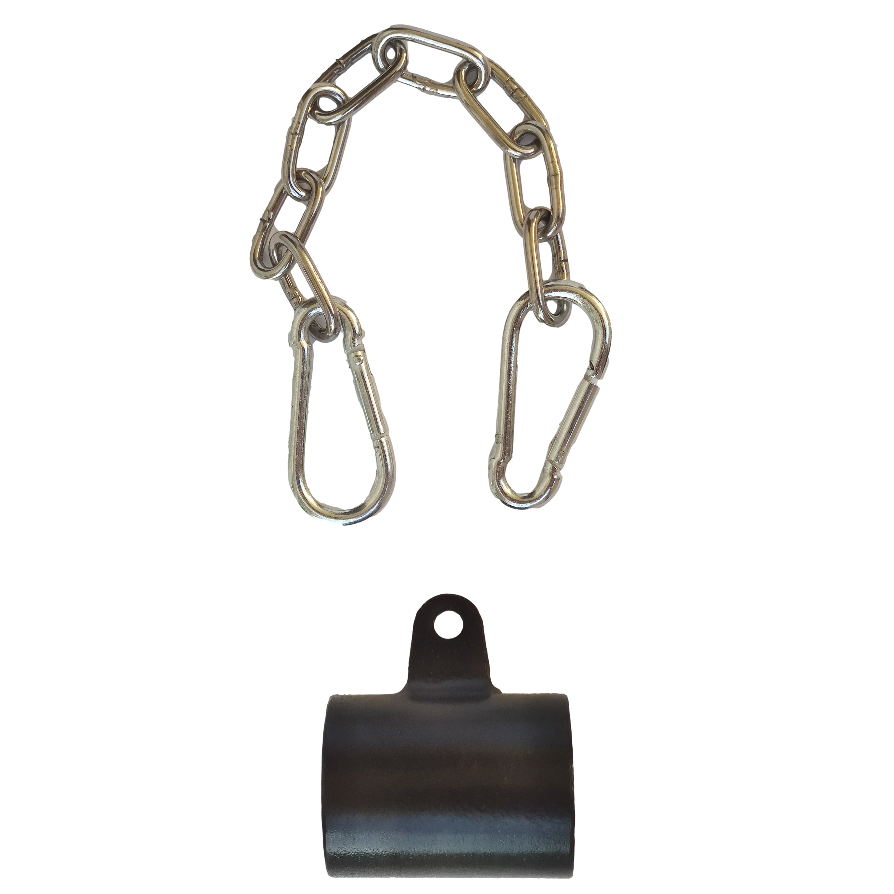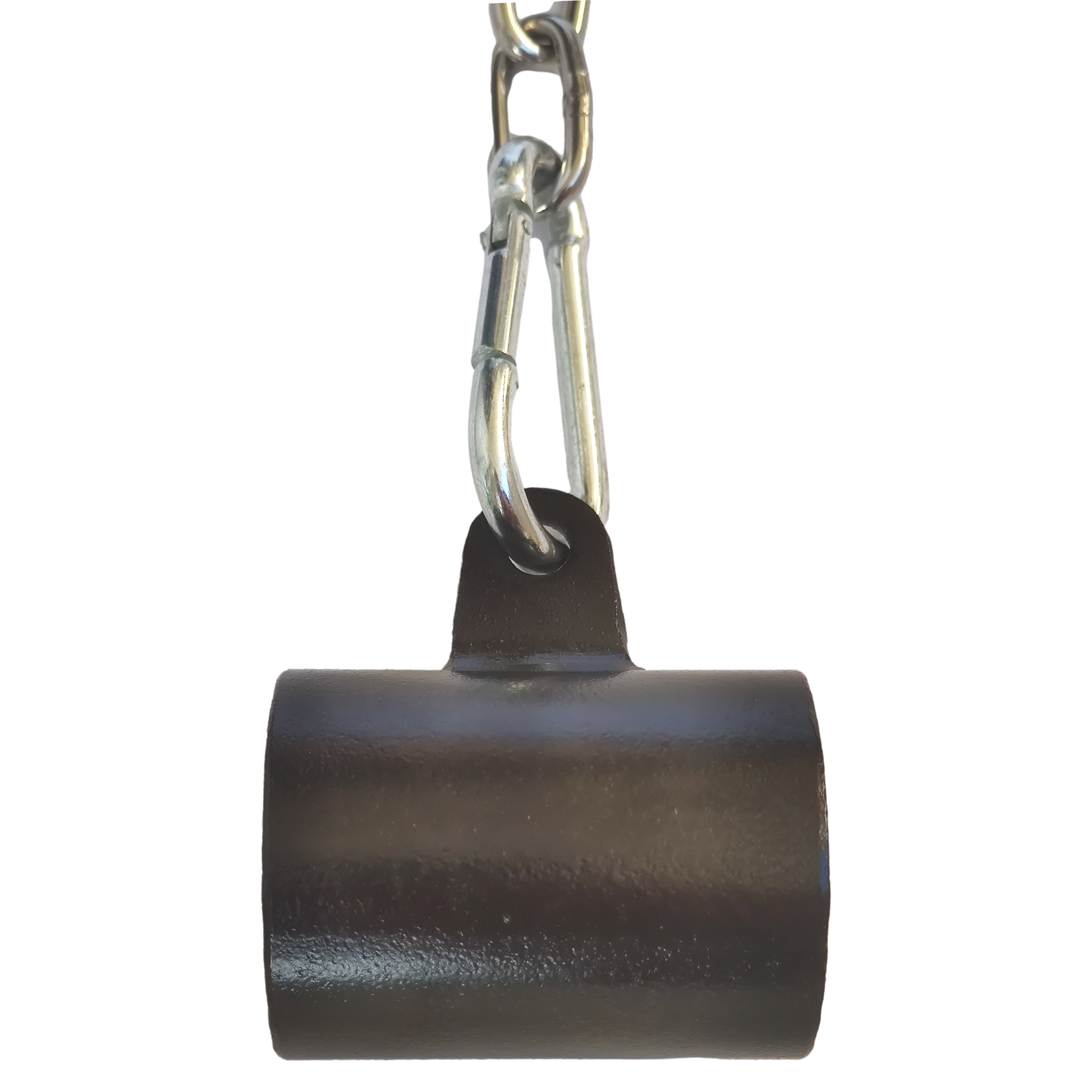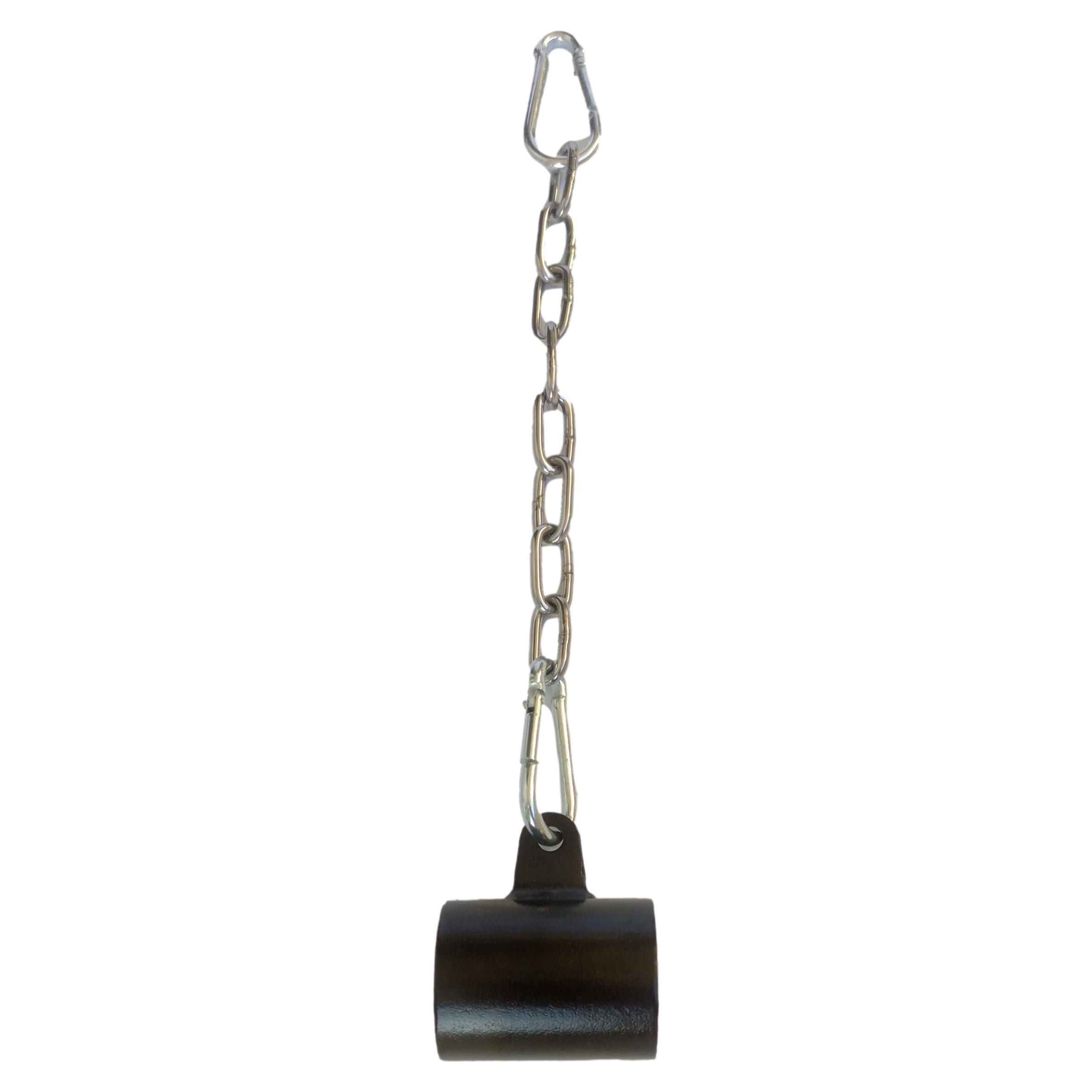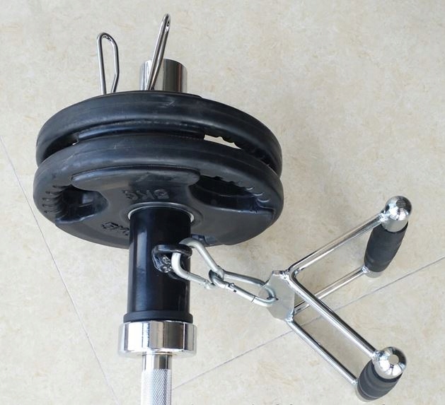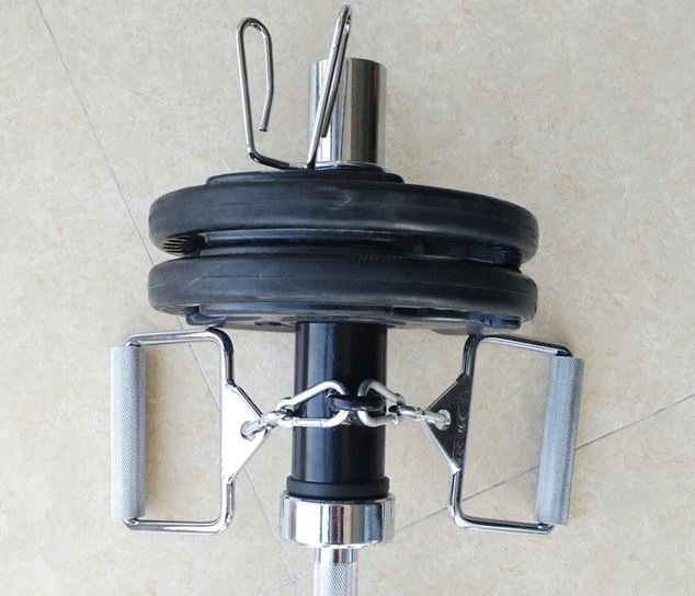 Uchwyt został również wyposażony w dwa karabińczyki i łańcuch, za pomocą których możesz łączyć uchwyt z różnymi innymi akcesoriami do ćwiczeń. Za ich pomocą możesz przymocować do uchwytu drążek prosty, V-bar lub dowolny inny, w zależności od wykonywanych ćwiczeń.